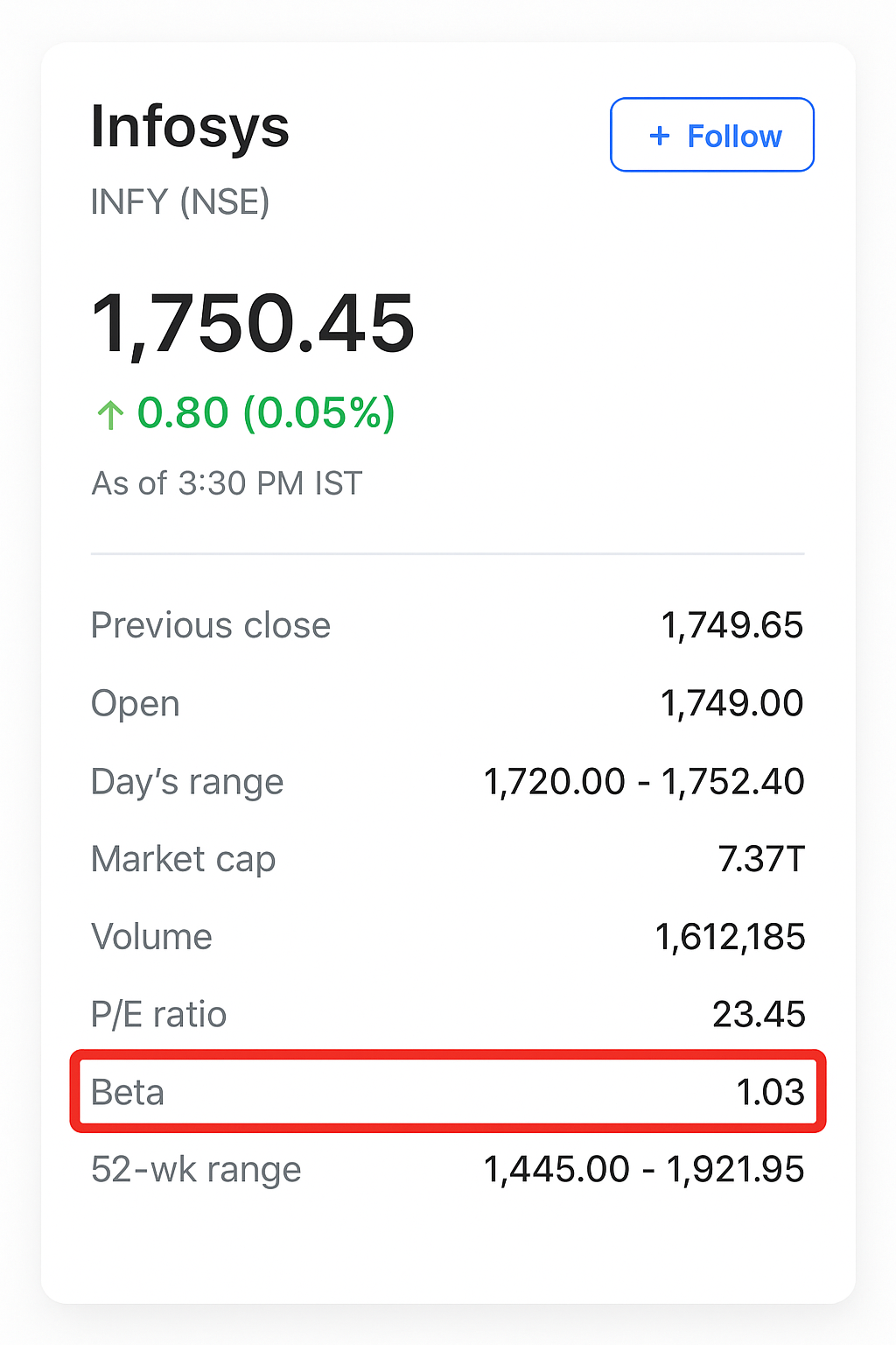 Beta shows how sensitive a stock is to market moves. A beta of 1 means the stock tends to move with the market. Above 1 means bigger swings. Below 1 means smaller swings. You can use beta to judge risk, size positions, and estimate expected return with CAPM. In this guide, you will learn the meaning, the formula, a quick example, where to find beta for Indian stocks, and the limits you must respect.
