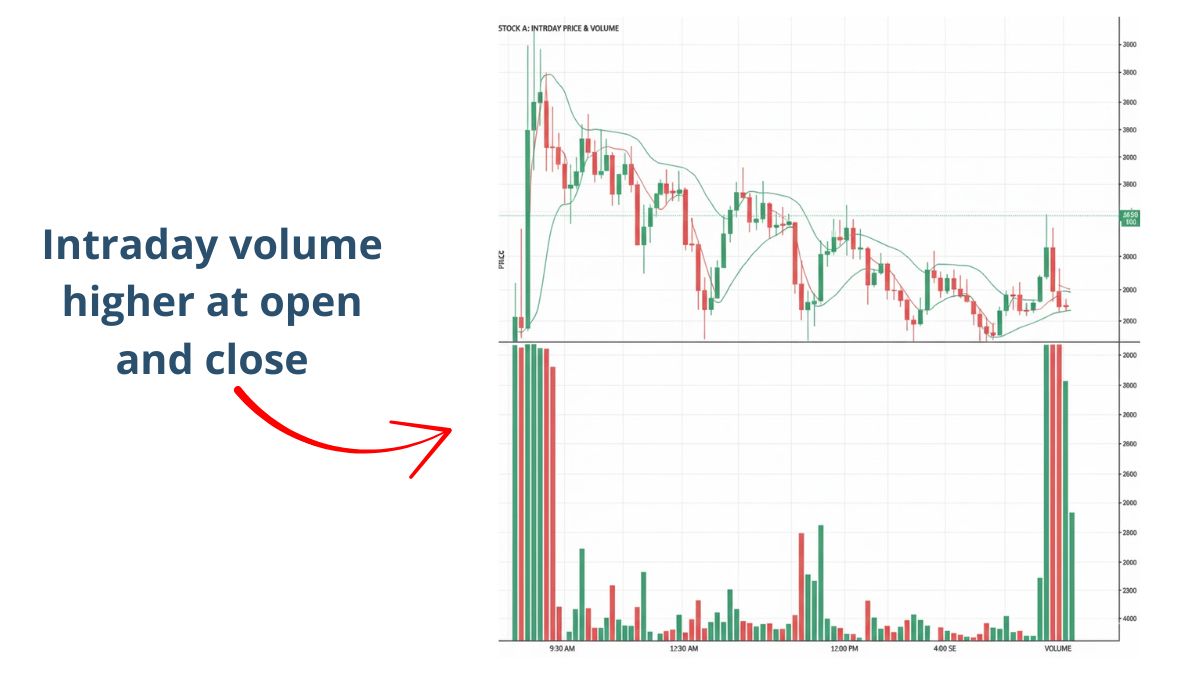 - Typical intraday pattern, busy at open and close, quieter mid-session.
